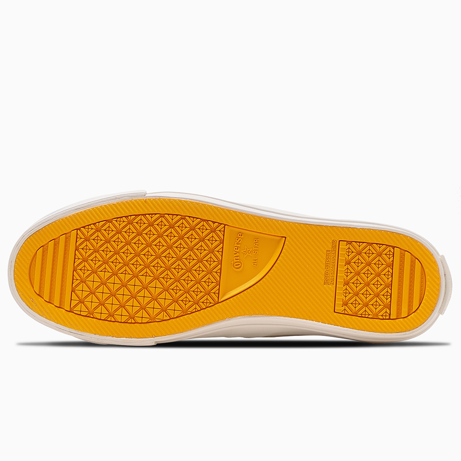 ベージュのスエードアッパーにUNIONのキーカラーであるイエローのラベルやアウトソールをレイアウト。