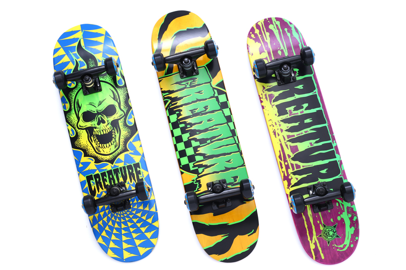 Creatureのコンプリートデッキ。写真左からBoneheadzzz(7.4×27.6)、Go Home Mini(7×29.2)、Reverse Stain Micro(6.75×28.5)。