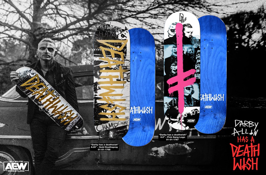 アメリカのプロレス団体AEW(All Elite Wrestling)の所属レスラーでスケーターでもあるダービー・アリンとDeathwishのコラボデッキが登場。