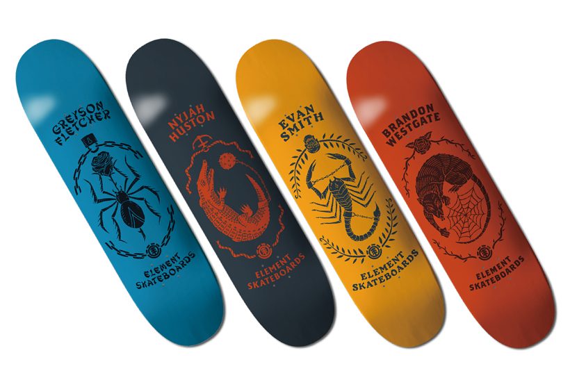 Verminシリーズ。写真左から、Greyson Spider(8.125×31.625)、Nyjah Gator(8×31.75)、Evan Scorpion(7.375×30)、Westgate Rat(8×31.75)。すべて¥11,880
