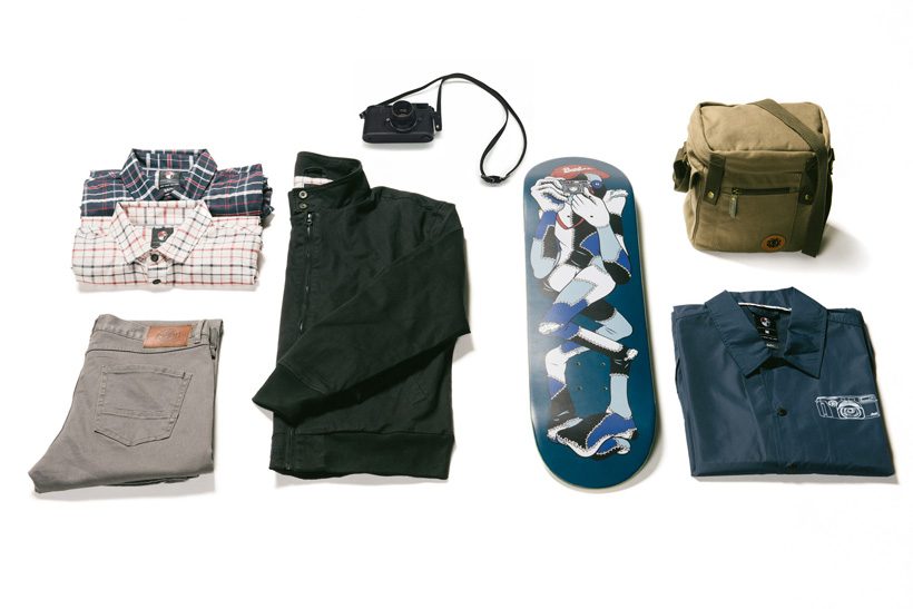 写真左から、Nerd Shirt L/S 各色ともに¥10,260、Pant ¥12,960、Jacket 参考商品、Barbee Shutter(8.25×32.25)¥11,880、Camera Bag ¥9,720、Coaches Jacket ¥11,880