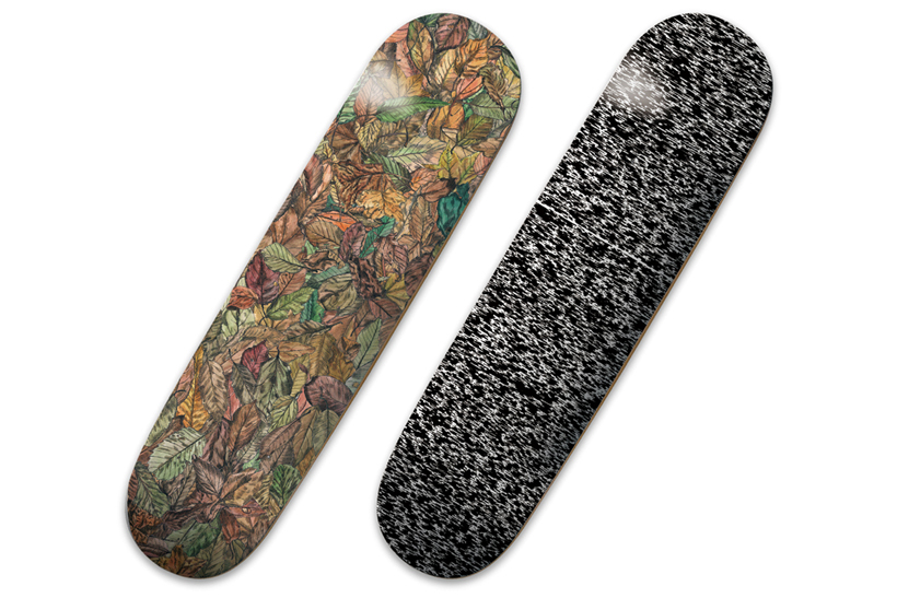 落ち葉をモチーフにしたLeafデッキ(7.875×32)、モニターのノイズをモチーフにしたNoiseデッキ(7.75×32.35)。ともに¥8,640
