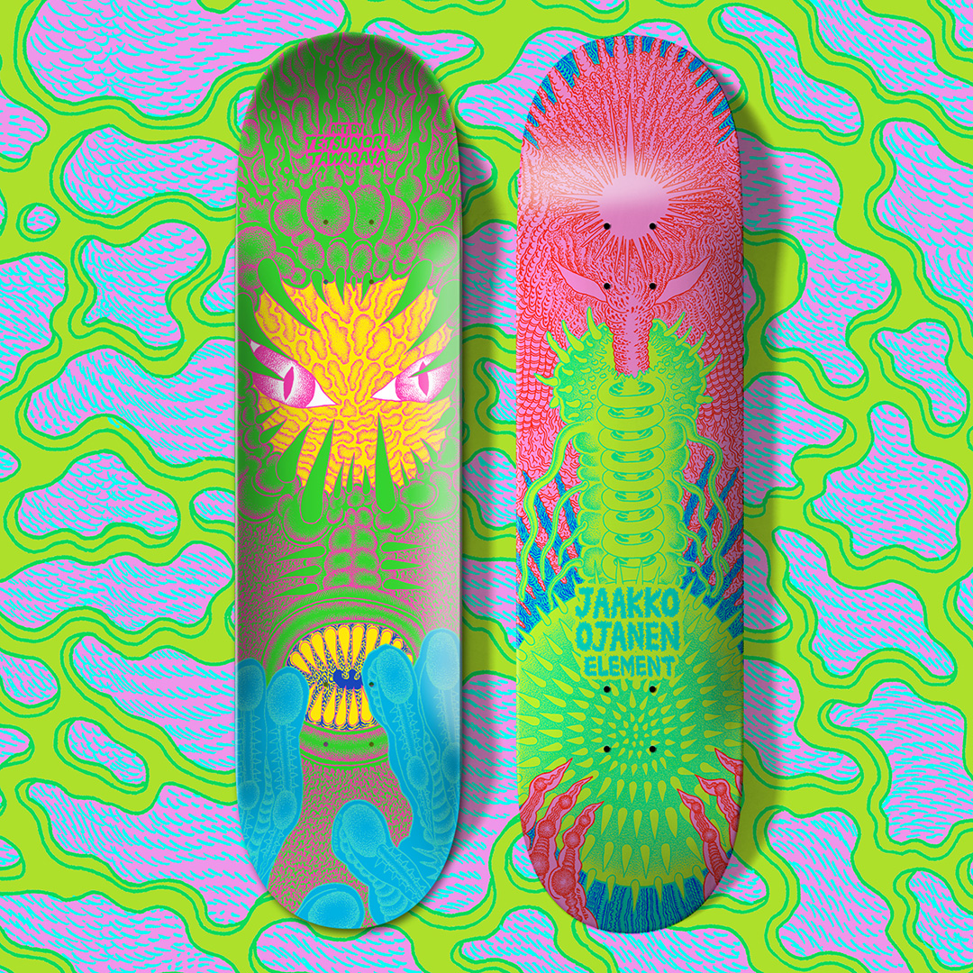 独特なSFコミック調の世界観や色彩がデッキやアパレル、シューズに映える。