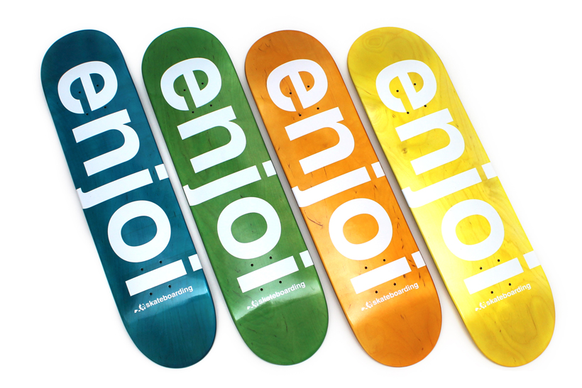 色ととりどりのデッキにロゴがプリントされたシンプルなSprayed Spectrum。写真左から、Blue(7.6インチ)、