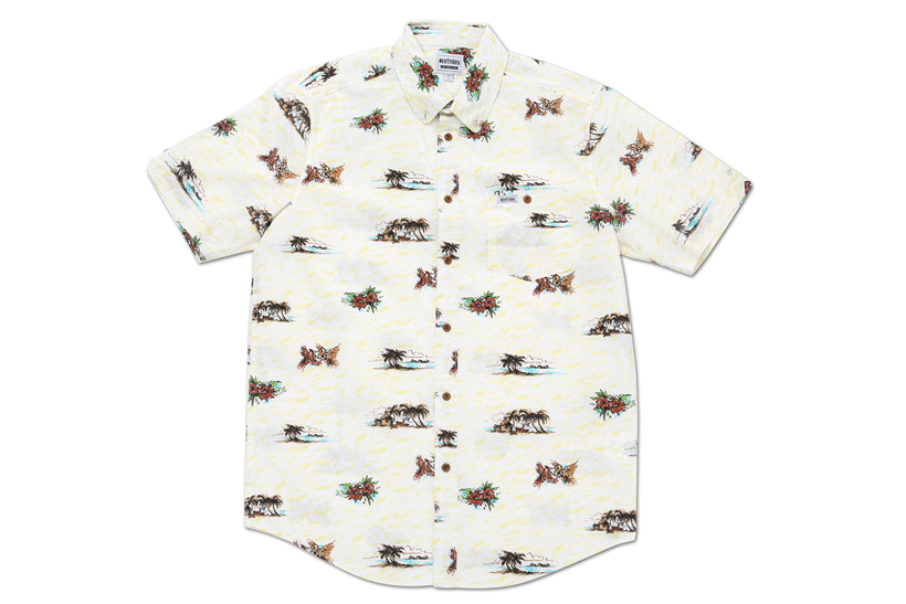 ビーチやハイビスカス、鳥などのグラフィックが全面に描かれたS/Sボタンダウンシャツ。¥8,640