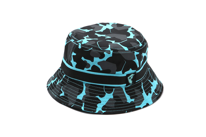 ブラックやグレーに明るいブルーを合わせた目を引くカラーリングが特徴的なバケットハット。