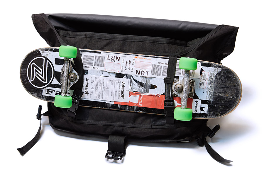 メッセンジャーバッグのフラップを開けるとデッキを固定できるストラップがついたスケーター仕様。
