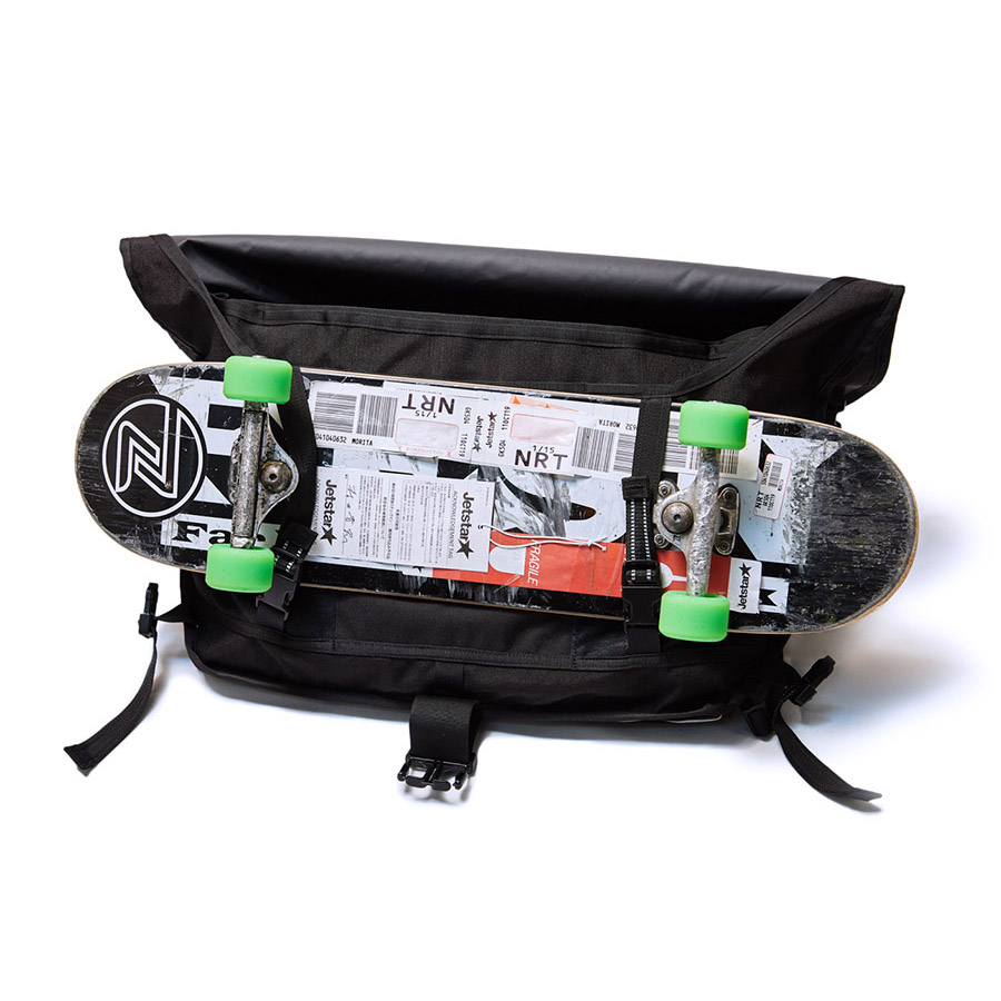 メッセンジャーバッグのフラップを開けるとデッキを固定できるストラップがついたスケーター仕様。