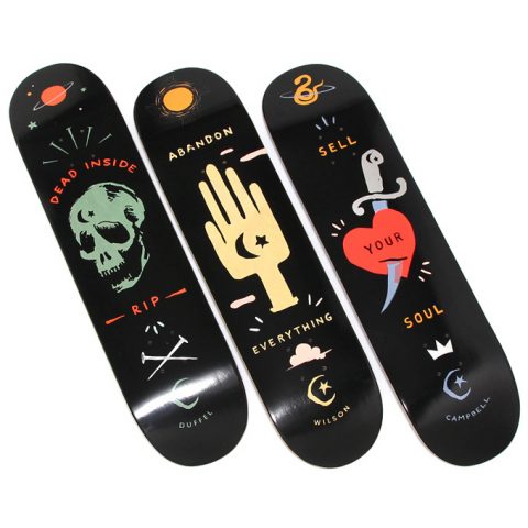 写真左から、Abandonシリーズのコーリー・ダッフェル(7.75×31.625)、コール・ウィルソン(7.875×31.375)、エイダン・キャンベル(8×31.625)。すべて¥11,880