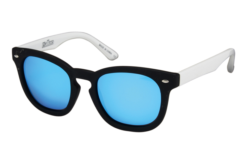 ウェリントンタイプのシンプルなデザインにブラックのフレームとホワイトのテンプルの対比がグッド。ブルーミラー偏光レンズも存在感を主張する。FBL 044-3 ¥5,616