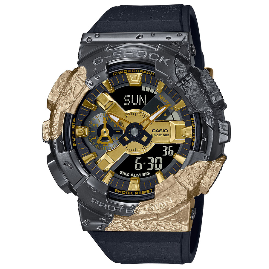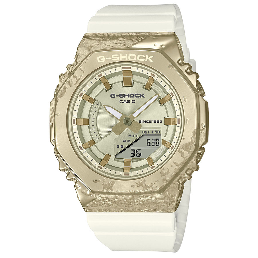 ベゼルにゴールドIP、文字盤にゴールドの蒸着処理を施し黄金色のカルサイトを表現。GM-S2140GEM ¥33,000