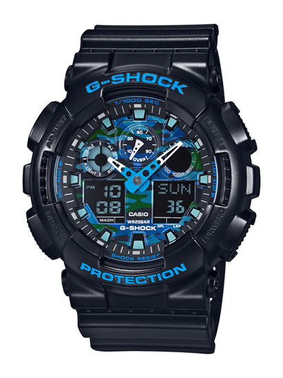 下段、文字盤にブルーを基調とした迷彩柄を採用したGA-100CB-1AJF ¥16,200