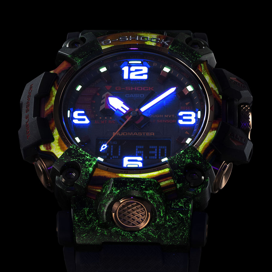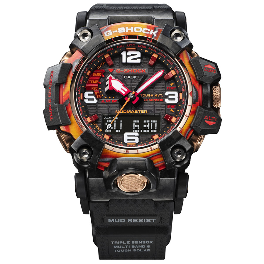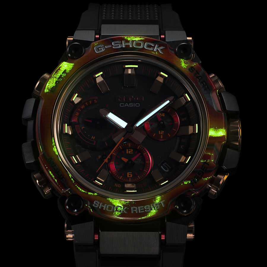 太陽フレアを蓄光素材のマーブル模様の積層ベゼルで表現したMTG-B3000FR-1AJRとGWG-2040FR-1AJRの2モデル。