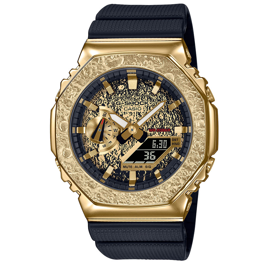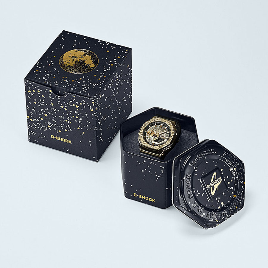 オクタゴンベゼルが特徴のGM-2100をベースに、ゴールドIPを施した鍛造ベゼル、メタル遊環、美錠と蒸着文字により月のイメージを表現。裏蓋には月のクレーターが刻印されるというこだわりよう。