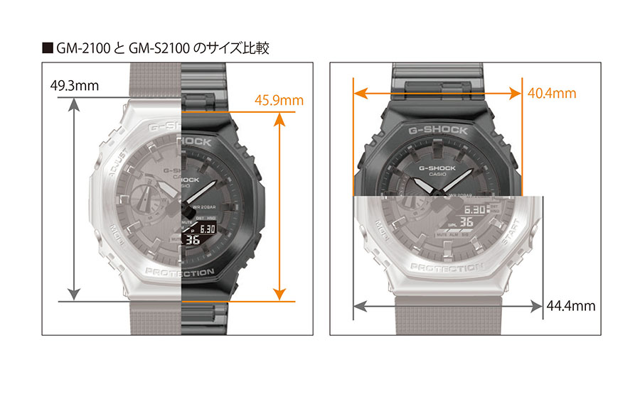 シンプルなデザインと特徴的なフォルムで人気のGA-2100にメタルを採用したGM-2100と、それを薄く、小型化したGM-S2100が発売中。