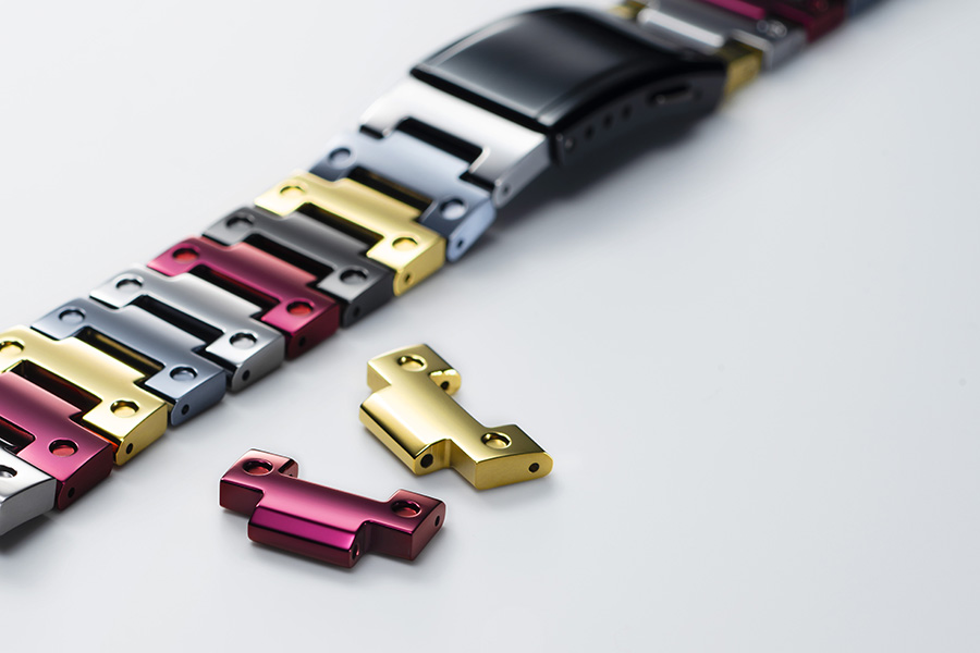 ケースにはゴールドIP。新開発のダークブルーに加え、レッド・ライトグレー・ダークグレー・ゴールドのマルチカラーIPバンドを採用。