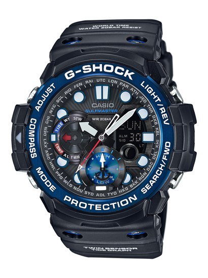 連続計測可能な方位計測機能や温度計測機能、タイドグラフやムーンデータなどの最新機能をマリンテイスト溢れるデザインに搭載したGULFMASTER。上段左から、GN-1000C-8AJF、 GN-1000B-1AJF。下段左から、 GN-1000-1AJF、 GN-1000-9AJF。各色すべて¥34,560