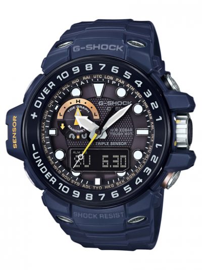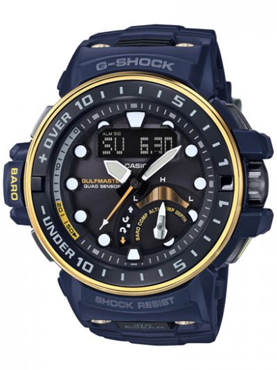 過酷な洋上や水中での救難任務などをサポートするフロッグマンをベースにしたGWF-D1000NV-2JF ¥140,400、クワッドセンサー搭載のガルフマスターGWN-Q1000NV-2AJF ¥113,400