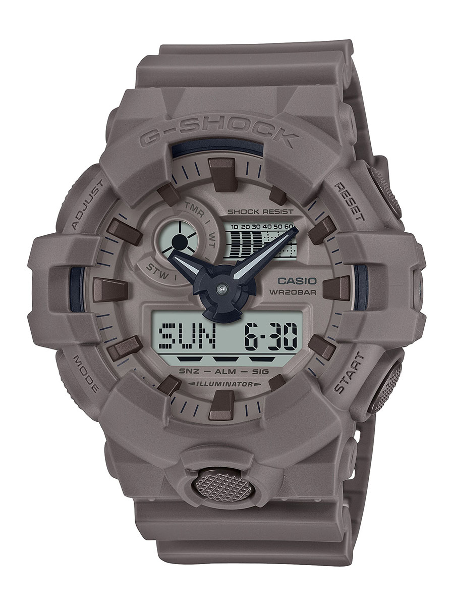 定番のDW-5600、オクタゴンケースのGA-2100、フロントボタンを採用したGA-700、ビッグケースのGA-2200をベースに、カジュアル〜アウトドアシーンに映えるクールなアースカラーを採用。