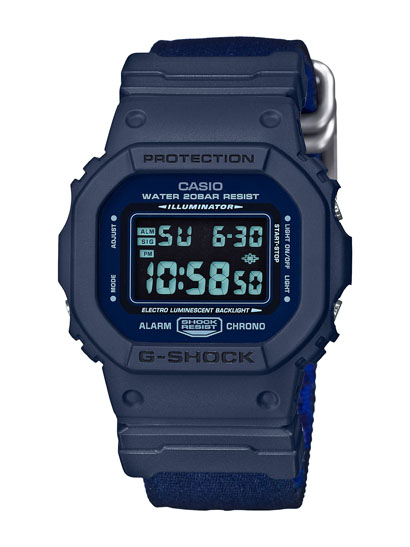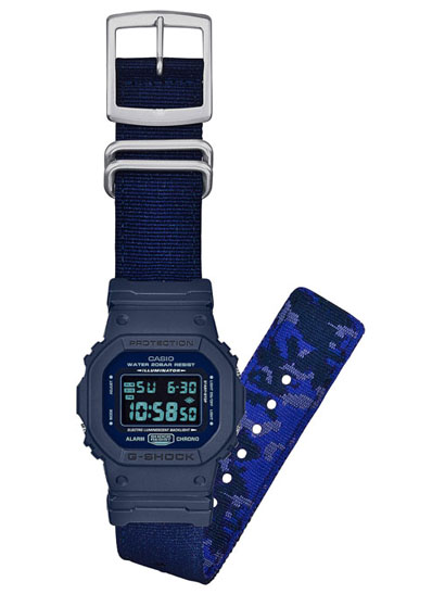 ナイロンバンド裏にケースと同じネイビーをモチーフにした迷彩柄を採用。DW-5600LU-2JF ¥12,960
