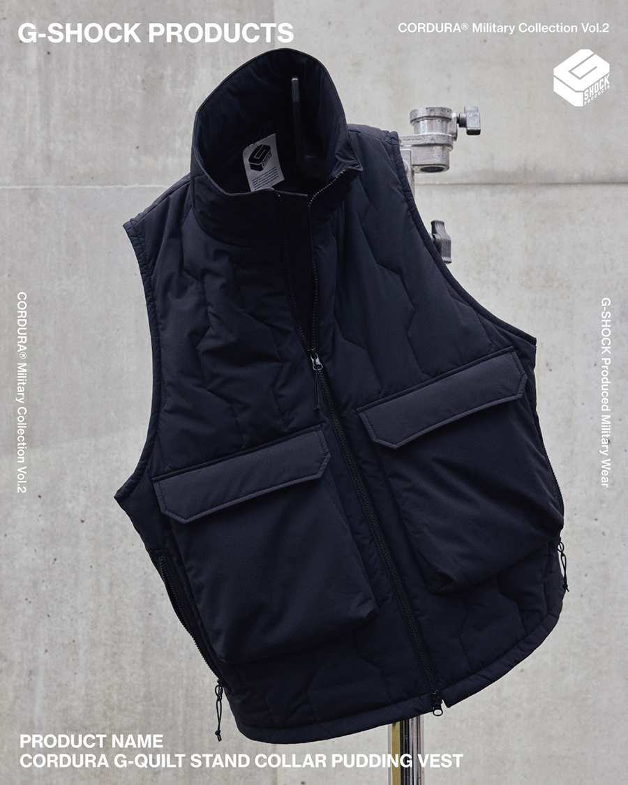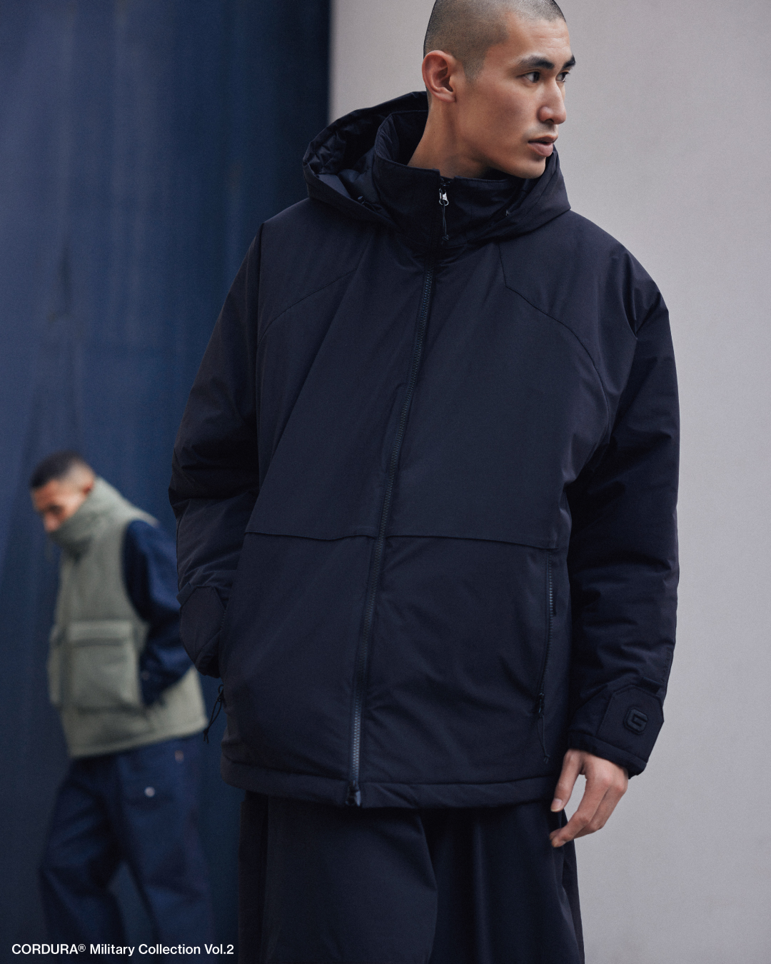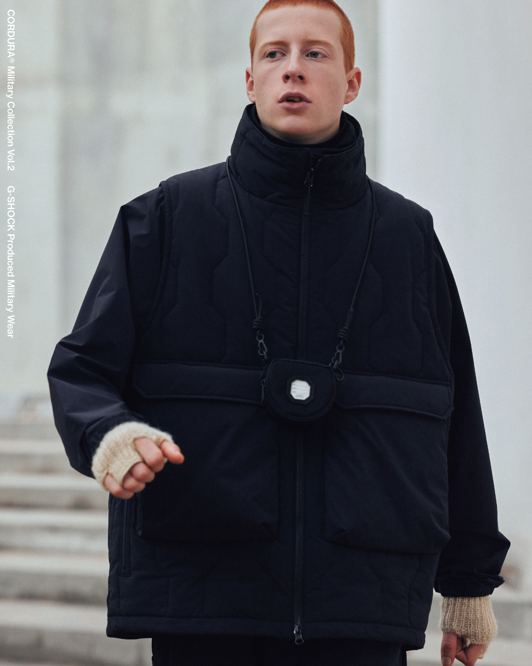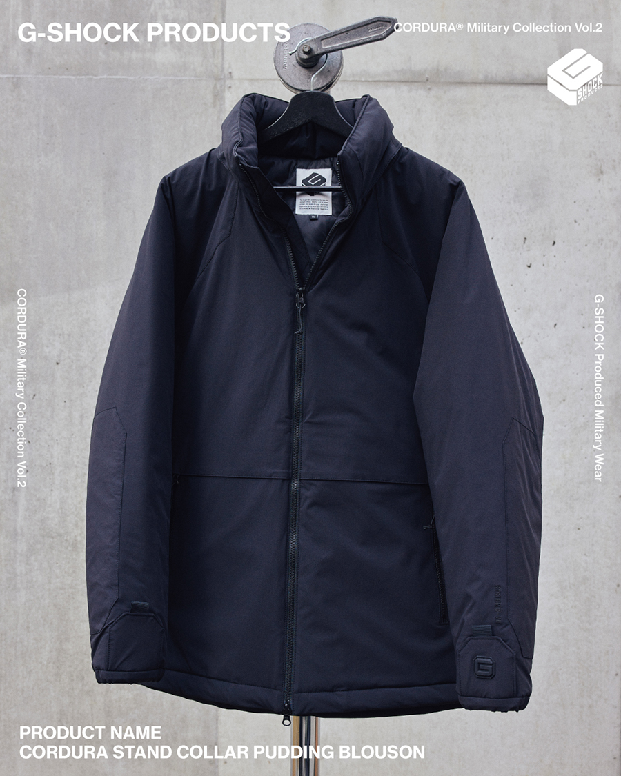 エルボーパッチや切り替え部分をG-SHOCKらしい8角形で表現。左右の袖口には時計を見るためのディテールを用意。CORDURA STAND COLLAR PADDING BLOUSON ¥52,800