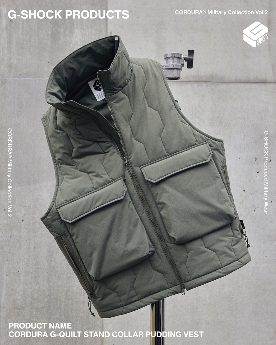 8角形のオリジナルキルトステッチが特徴的なスタンドカラーのキルティングベスト。CORDURA G-QUILT STAND COLLAR PADDING VEST ¥30,800