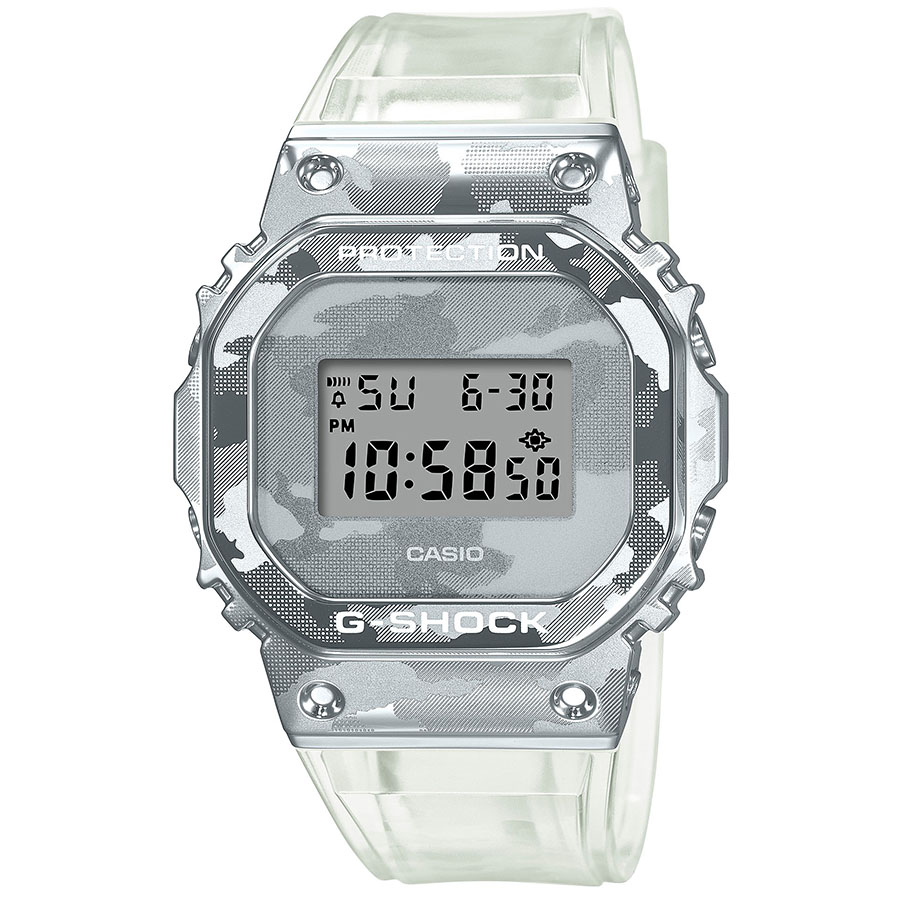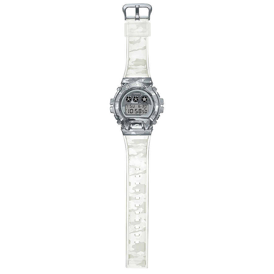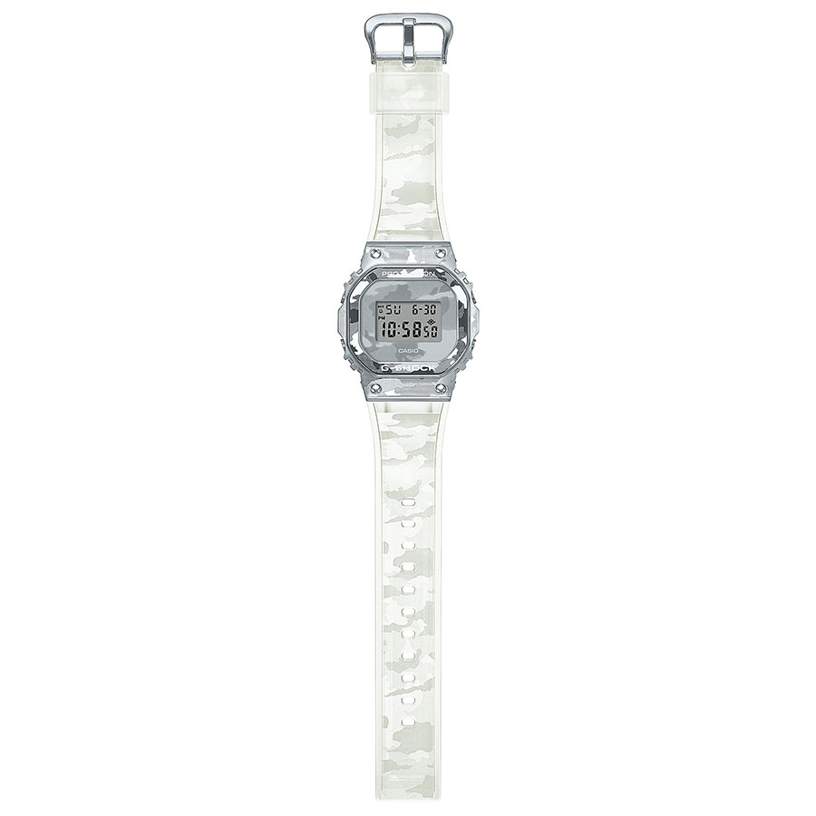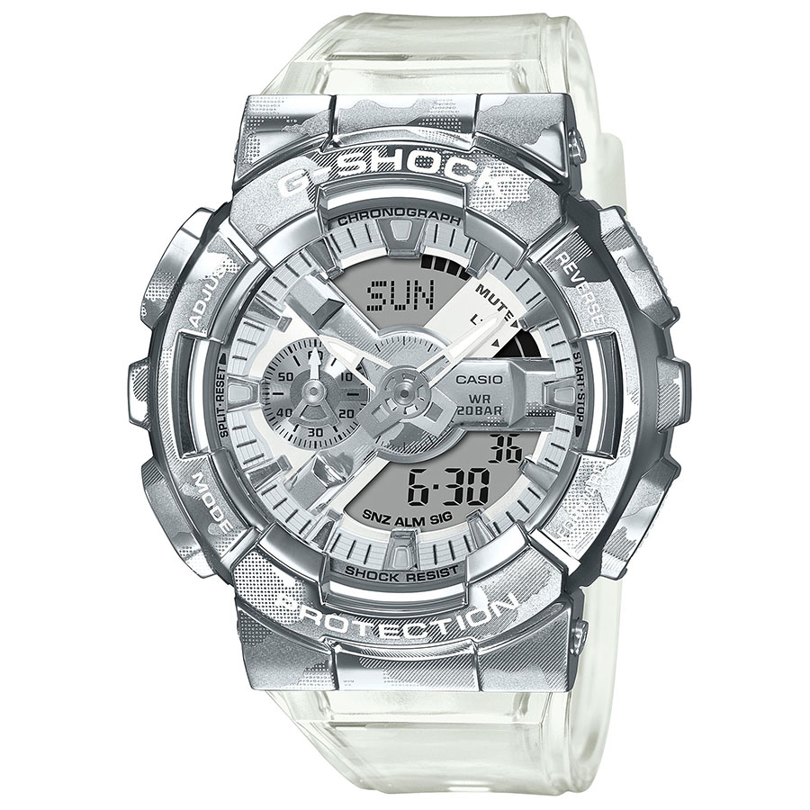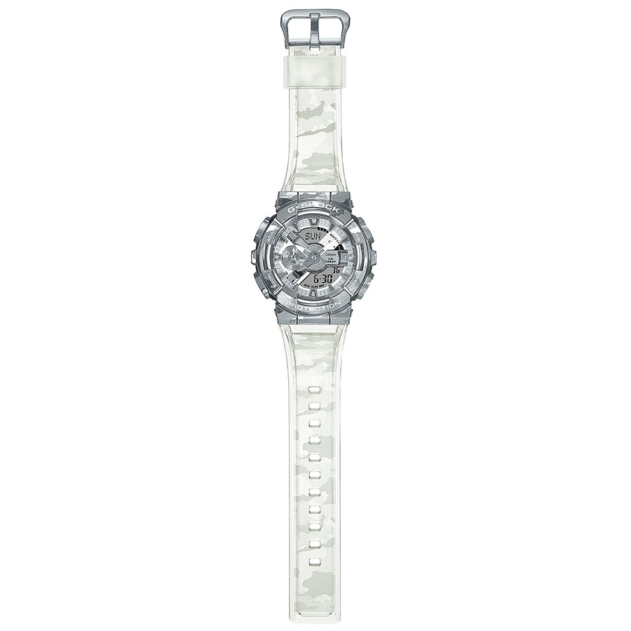ケースにレーザー加工を施すことで表現されたカモ柄が半透明のバンドと相まって涼しさを演出。シルバーのメタル素材がゴージャスな雰囲気。