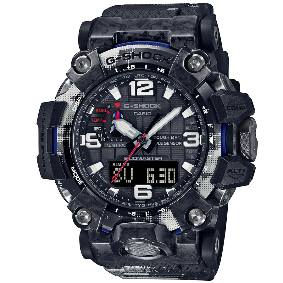 新開発のフォージドカーボンベゼル、電波受信機能による正確な時刻表示、トリプルセンサーなど優れた耐久性・機能性を備えている。GWG-2000TLC-1AJR ¥110,000
