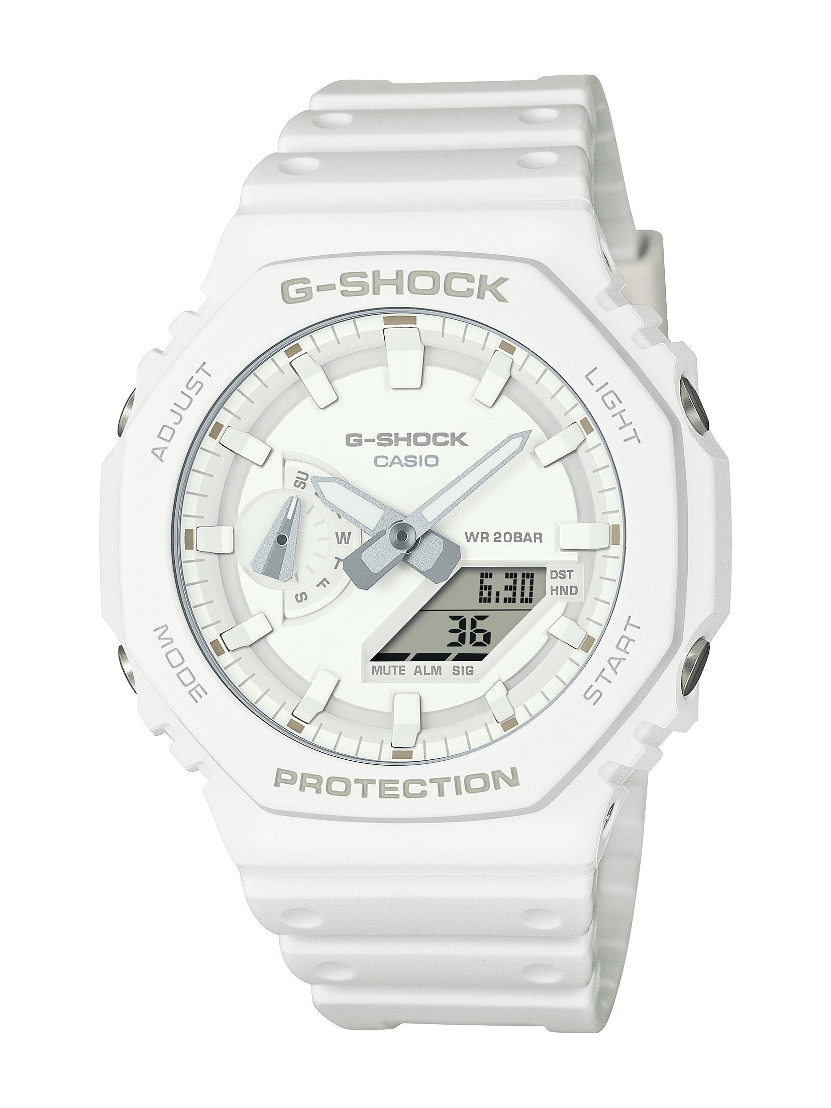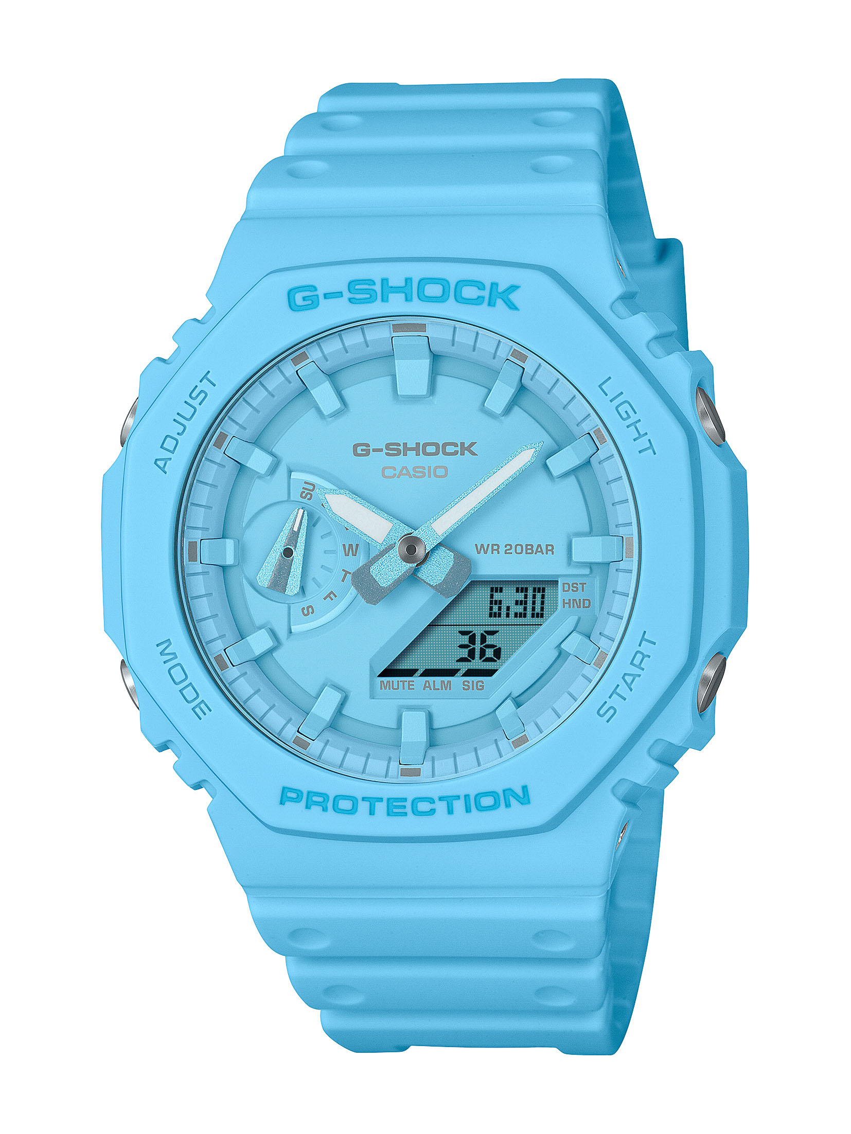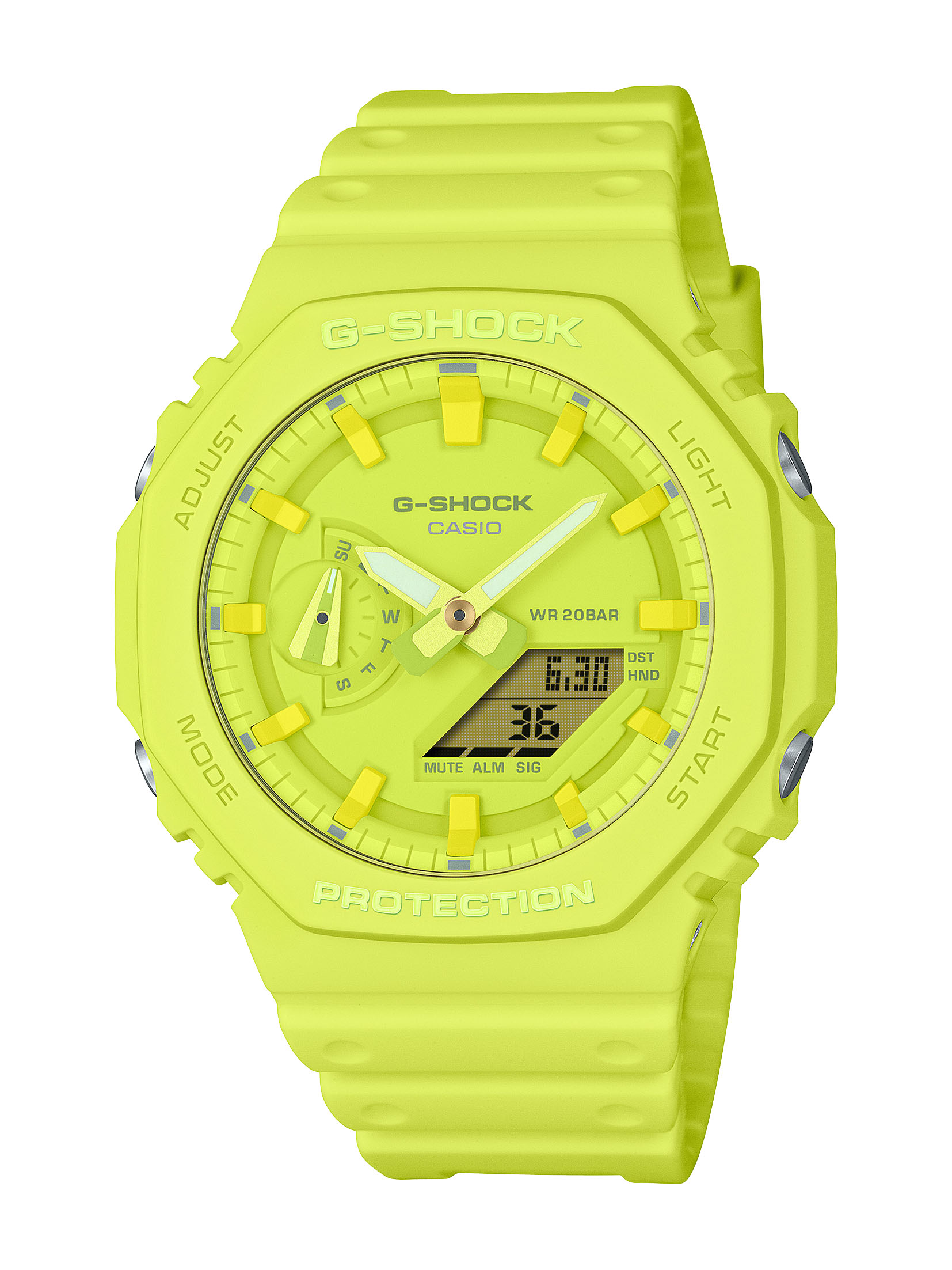 オクタゴンベゼルが人気のGA-2100をベースに、ターコイズブルー、ホワイト、ヴォルトイエローの3色展開。