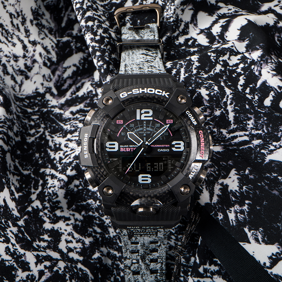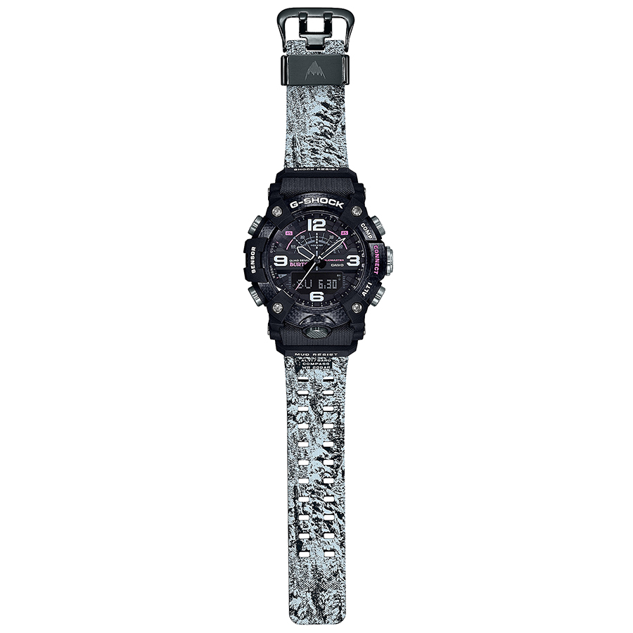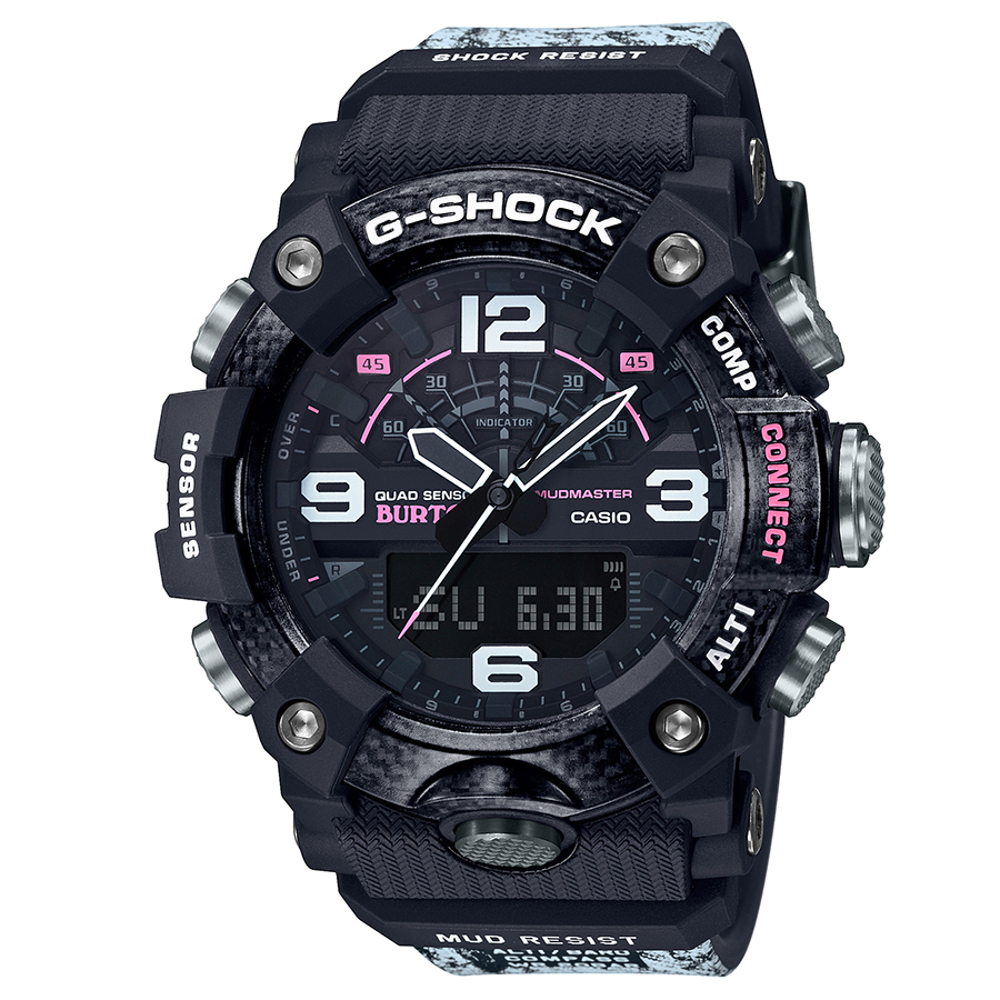 カーボンコアガードやマッドレジスト構造に加え、トリプルセンサー+加速度センサーなど、G-SHOCKが持つさまざまなテクノロジーを投入。GG-B100BTN-1AJR ¥57,200