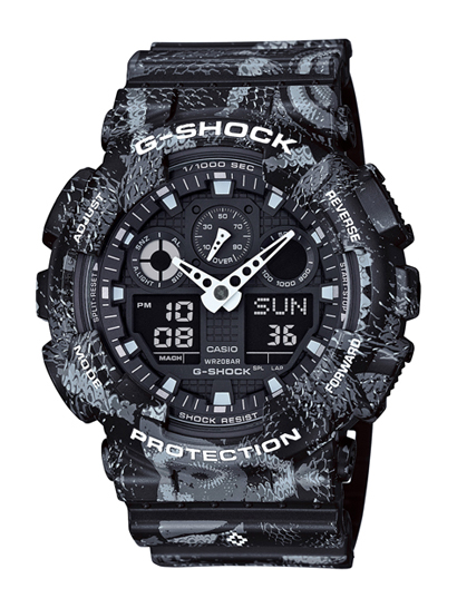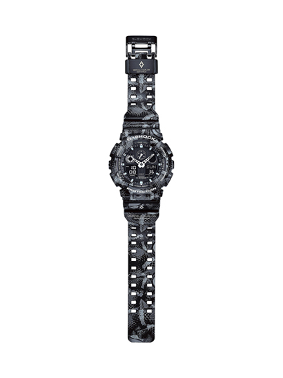 精悍なブラックのGA-100をベースに、MARCELO BURLONを代表する柄であるスネークをモチーフにしたプリントを採用。