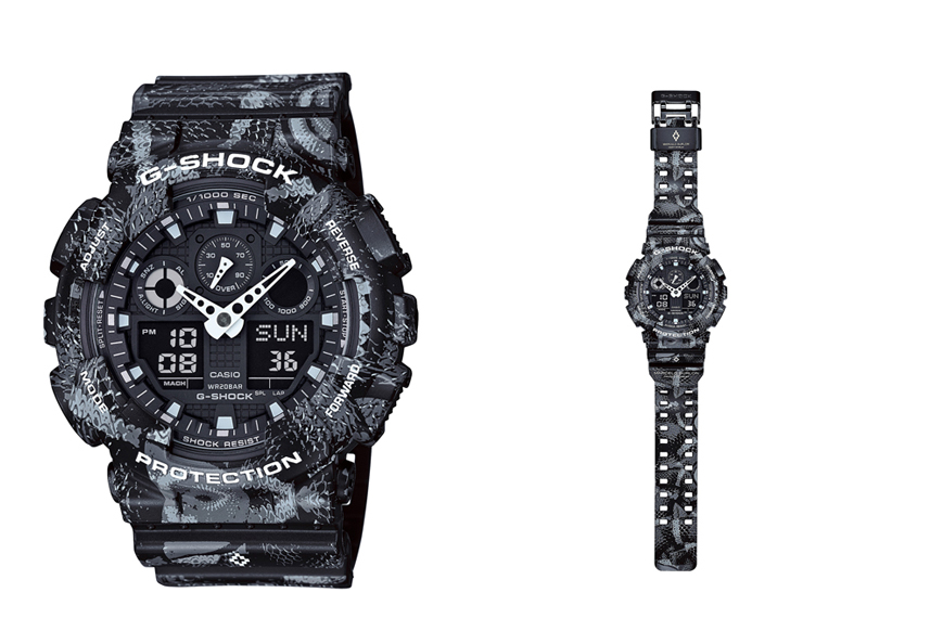 ケースやベルトに至るまでスネークモチーフのプリントを施したG-SHOCK × MARCELO BURLON GA-100MRB-1AJR ¥25,920