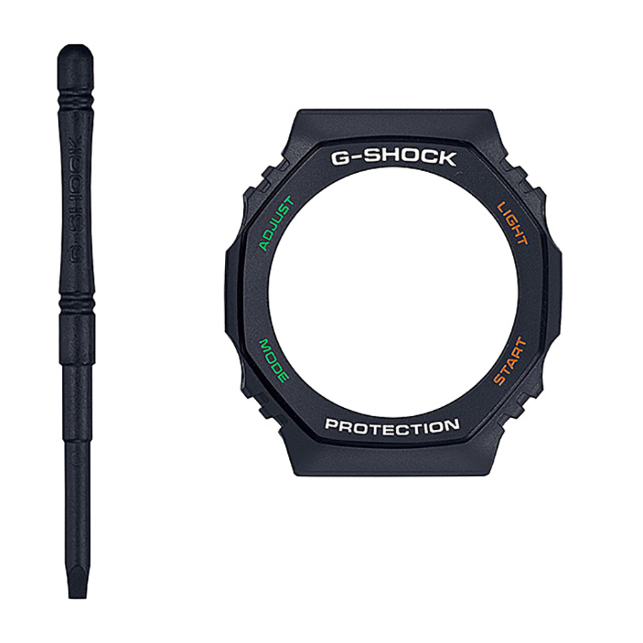 オクタゴンベゼルのGAE-2100をベースに、文字盤や遊環、美錠にルービックキューブのデザインや色を採用。