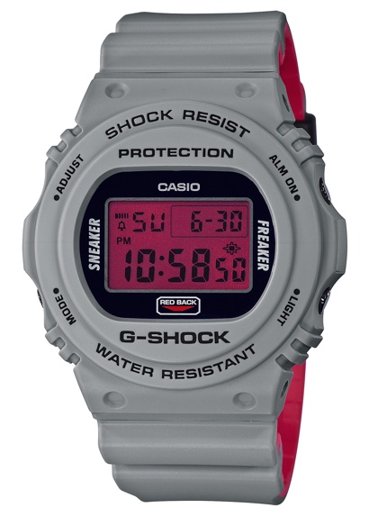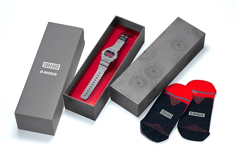 グレーをベースに、文字盤やバンド裏にレッドを用いたトリプルコラボモデル。蜘蛛の巣を描いた化粧箱に加え、STANCEのソックスもセットになっている。DW-5700SF-1JR ¥20,520