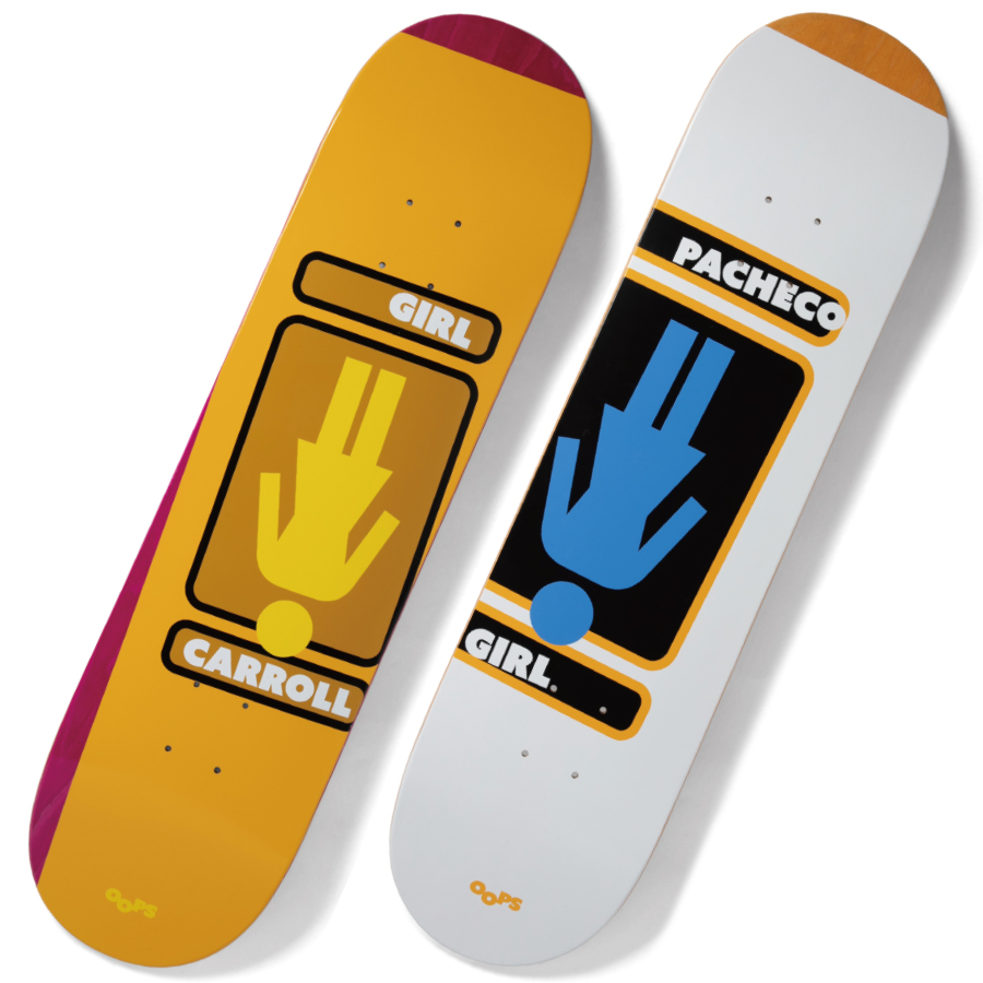 写真左から、Oops Mike Carroll Twin Tip(8.25 × 31.875)、Oops Tyler Pacheco(8 × 31.5)。ともに¥13,750