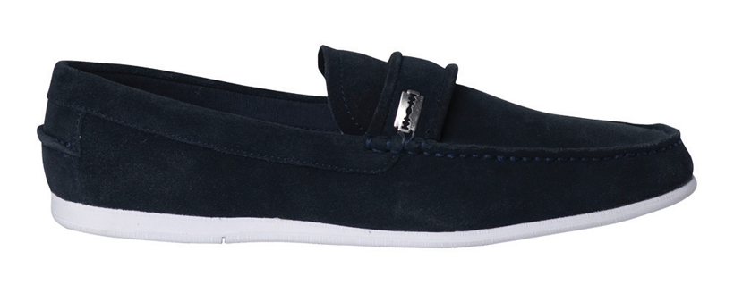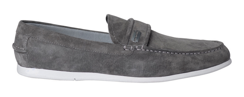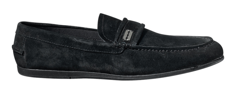 スエードのアッパーに鈍く輝くメタルプレートがアクセントのローファーシューズ。カラバリはブラック、ダークネイビー、ガンメタルの3色展開。¥12,600