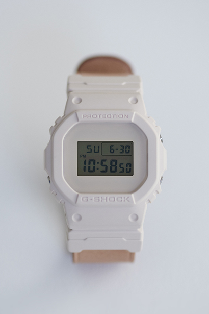 スリムシルエットのDW-5600をベースにしたミニマルなデザインはコラボモデルならでは。
