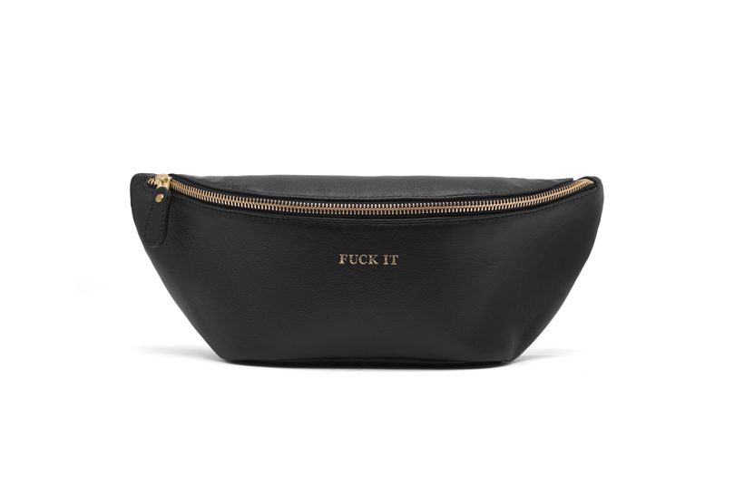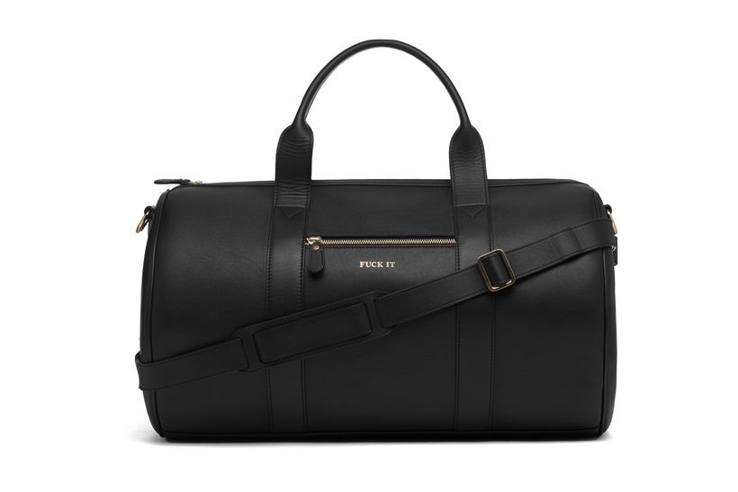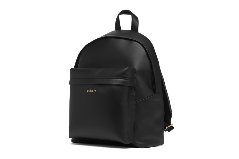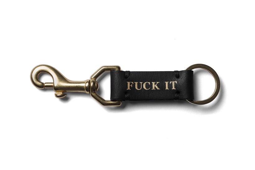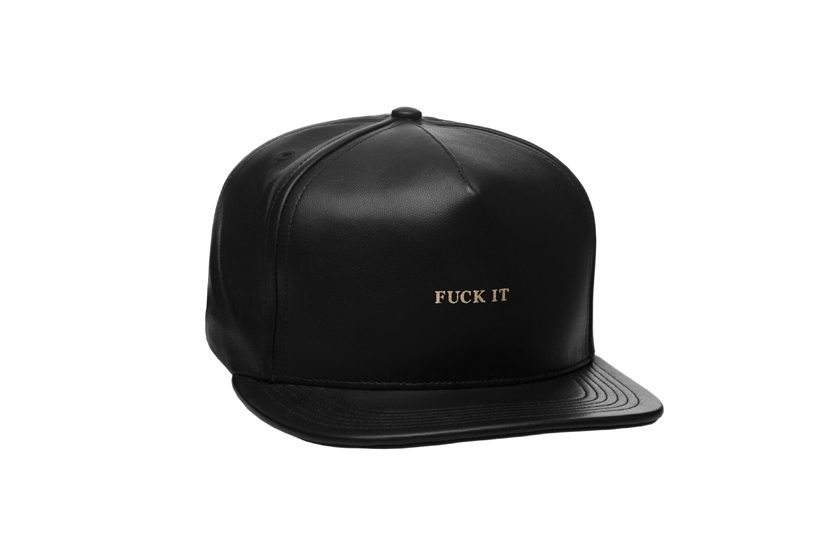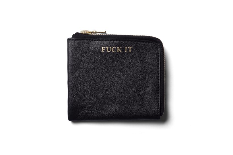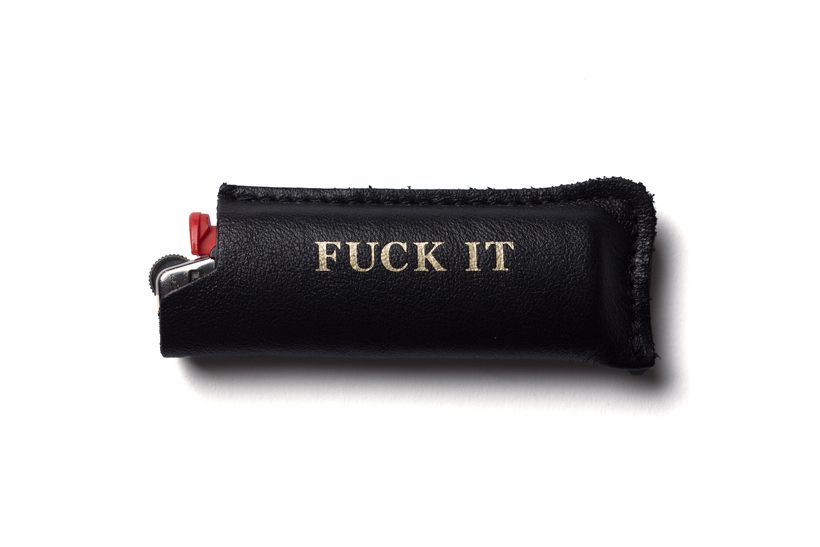 ブラックのレザーにブランドのスローガンである“FUCK IT”をゴールドでプリントしたアイテムの数々はLAのレザー職人によるハンドメイド(Tenga以外)。