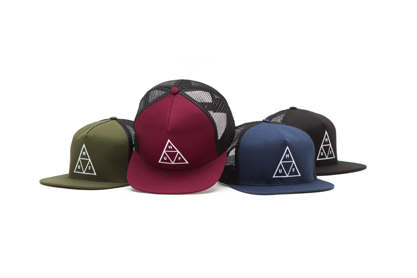 3つの三角形で構成されたHUFのTriple Triangleロゴをフロントに配置したメッシュキャップ。写真左から、オリーブ、バーガンディ、ネイビー、ブラックの4色展開。各色ともに¥7,020