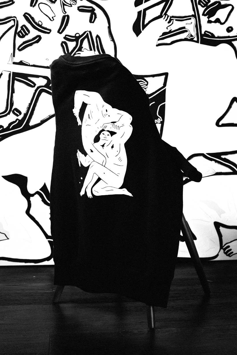 バイオレンスやカオス、闘争をモノクロで表現した象徴的な作品が、‘80年代を彷彿とさせるアイテムの数々に映える。
