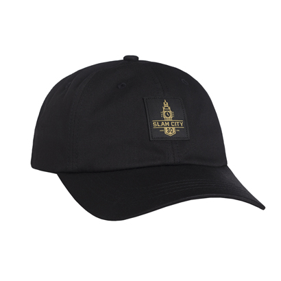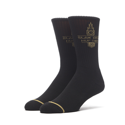 写真左から、フロントに今コラボのキービジュアルを配したHUF × SLAM CITY 6 PANEL ¥7,020、織りでキービジュアルを表現したHUF × SLAM CITY CREW SOCK ¥2,700