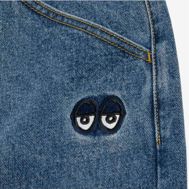 注目のデニムパンツはキレイなシルエットとEyesロゴ刺しゅうが魅力。