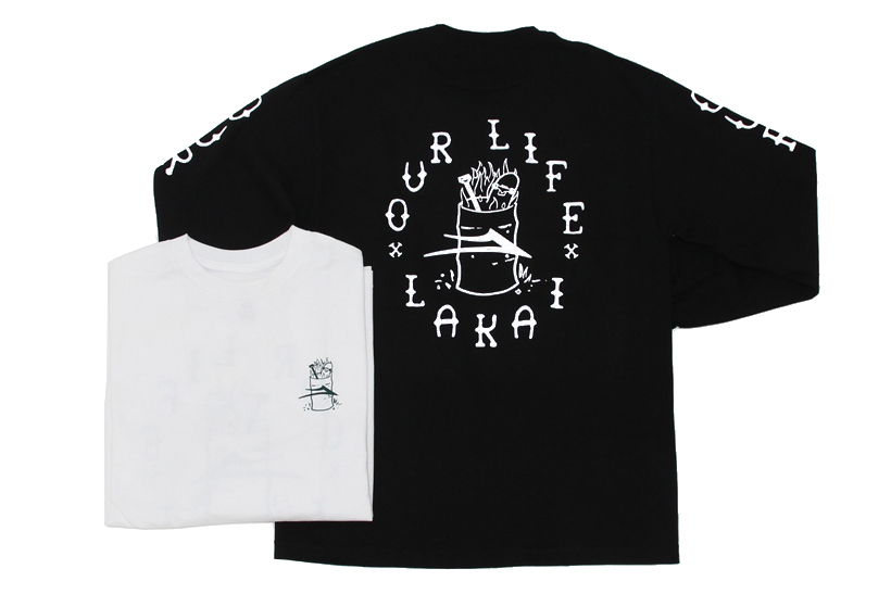 Our Lifeのドラム缶とLakaiのフレアロゴを組み合わせたプリントが配されたロンT。Our Life Bonfire LS Tee 各色ともに¥5,616