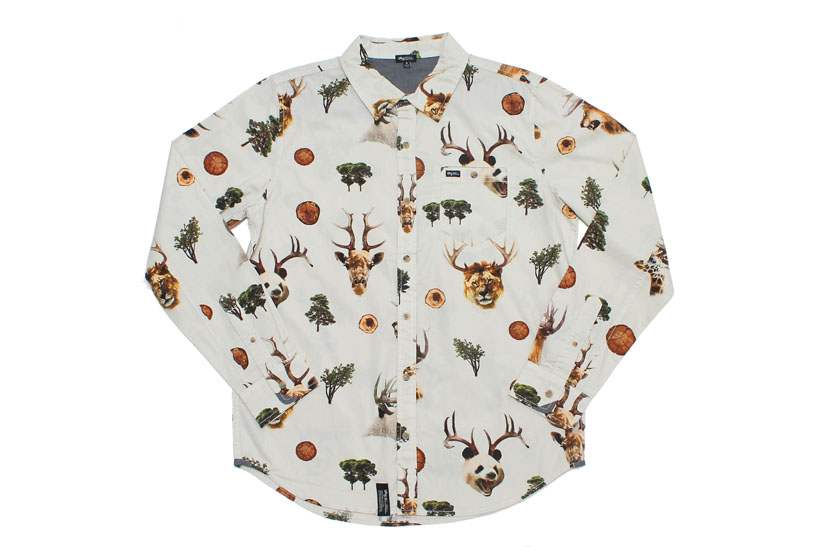 キリンやライオン、パンダに鹿の角が生えたグラフィックが主張するLSシャツ。