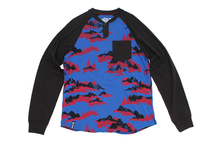 雲間に浮かぶ山の峰々をモチーフにしたかのような柄を使用したラグランヘンリーネックTシャツ。胸ポケットが付いているのもうれしい。