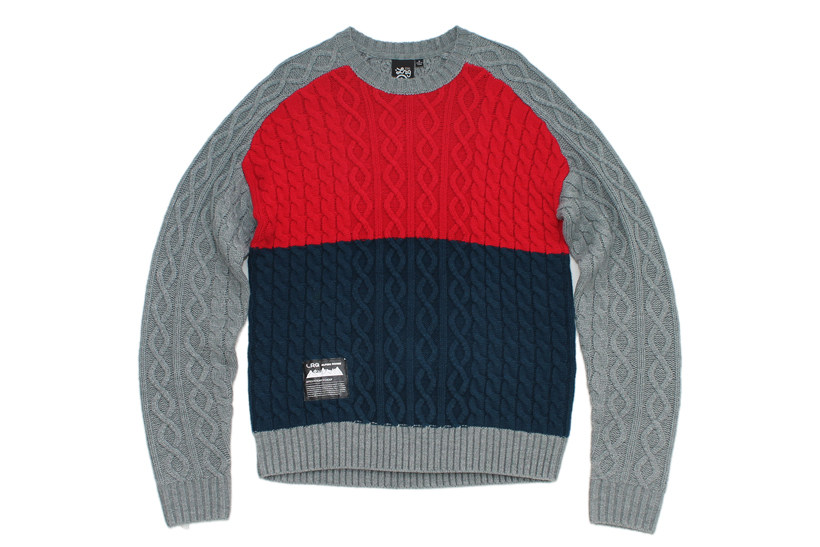 グレーをベースにしつつ、レッドとネイビーの糸をケーブル織りで仕上げたボディが存在感を主張するセーター。