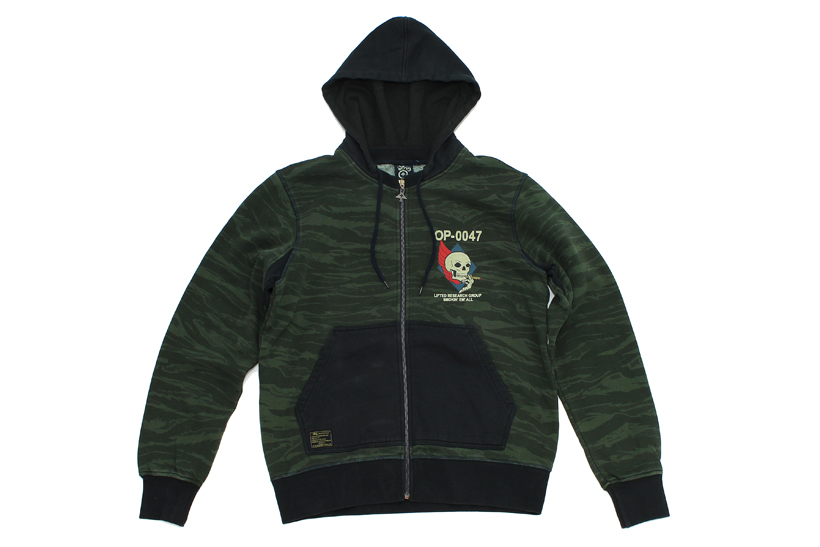 ダークトーンのタイガーカモとスカルモチーフのプリントが無骨な雰囲気のフルジップパーカは外付けのフードがいい感じ。