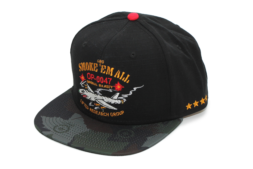 ジョイントをモチーフにした戦闘機の刺しゅうがインパクト抜群のキャップ。ブラックのコットンリップ×リーフカモの組み合わせもグッド。