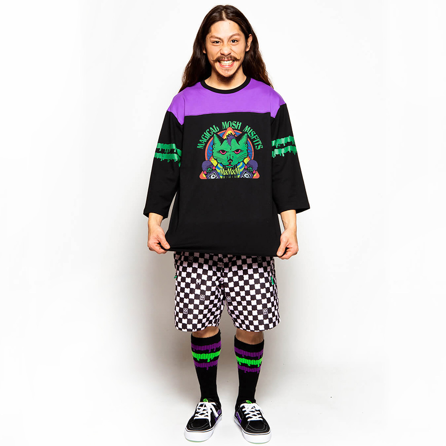 モヒカンのネコとデッキをフロントにプリントしたフットボールシャツ。袖のラインもどろどろ。Punk Cat Football Shirts ¥8,800