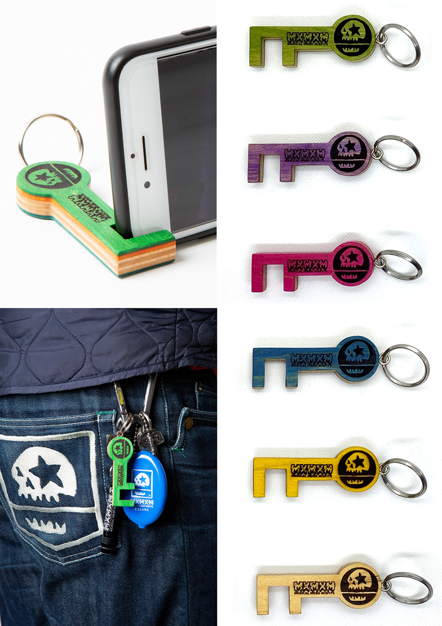 スマホスタンドとして仕様が可能なハンドメイドのキーホルダー。すべて¥3,850